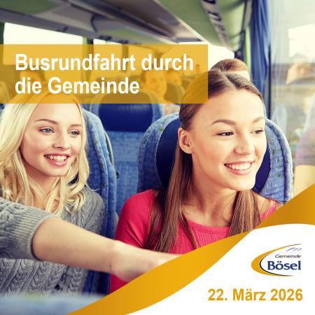 Im Rahmen der Veranstaltungen zur 150-jährigen politischen Eigenständigkeit lädt die Gemeinde Bösel am 22. März ab 14.00 Uhr zu einer Busrundfahrt durch das Gemeindegebiet mit dem Bürgermeister und den stellvertretenden Bürgermeistern ein. Den Teilnehmenden wird eine Rundfahrt mit vielen interessanten Informationen zu Unternehmen, Projekten und Maßnahmen geboten. Während der Fahrt und auch bei einer gemeinsamen Pause mit Kaffee/Tee und Kuchen werden die Fragen der Teilnehmenden beantwortet.