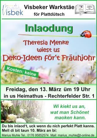 Am Freitag, 13. März 2026 lädt die Visbeker Warkstäe för Plattdütsch zum Kurs "Deko-Ideen för´t Fräujohr" ein. Theresia Menke zeigt allen Interessierten, welche Möglichkeiten es zum Dekorieren im Frühjahr gibt. Lost geht´s um 19.00 Uhr im Heimathaus Visbek an der Rechterfelder Straße. Der Eintritt ist frei. Anmeldungen nimmt Marius Muhle bis zum 10. März unter der Telefon-Nr. 017695852574 oder per Mail unter marius_muhle@t-online.de entgegen.