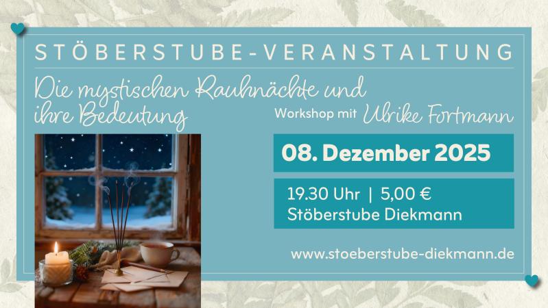 Ulrike Fortmann nimmt uns mit auf die Reise zu den alten Bräuchen. In gemütlicher Runde bei Tee und Kerzenlicht dürfen Wünsche formuliert, in die Zukunft geschaut und geräuchert werden.