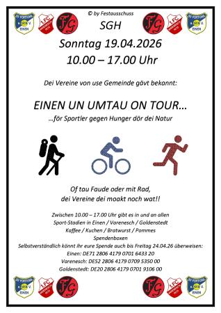 Die Sportvereine Fortuna Einen, der 1. FC Varenesch und der TuS Frisia Goldenstedt schließen sich wieder zusammen, um für den guten Zweck zu sammeln. Die Sportler-gegen-Hunger-Aktion „Einen un Umtau on Tour - för Sportler gegen Hunger dör dei Natur" findet am Sonntag, 19.04.2026 in der Zeit von 10.00 - 17.00 Uhr statt. In den Sportstadien in Einen, Varenesch und Goldenstedt werden zur Stärkung Kaffee, Kuchen, Bratwurst und Pommes angeboten.