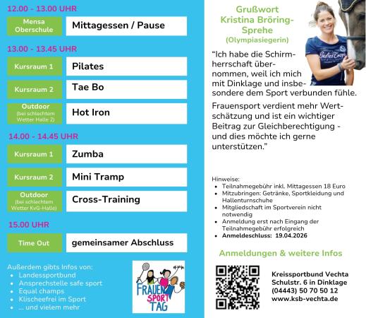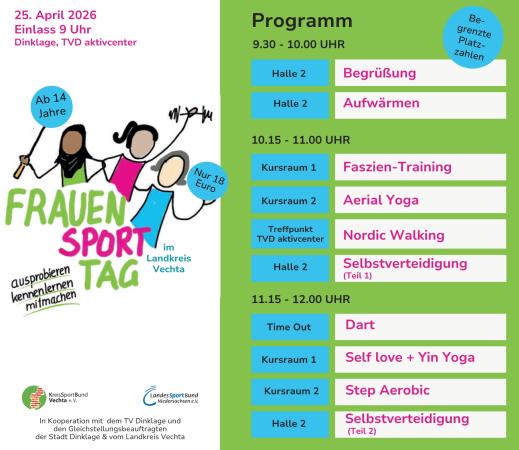 Am Samstag, den 25.04. laden der Kreissportbund und die Gleichstellungsbeauftragten von Stadt Dinklage und Landkreis Vechta zum Frauensporttag ins TVD aktivcenter nach Dinklage ein. Workshops und Sportarten sind vielfältig, Vorkenntnisse oder Mitgliedschaft nicht notwendig, die Plätze begrenzt: Also schnell anmelden: Frauensporttag 2026 - Ansprechpartner für Vereine im Landkreis Vechta