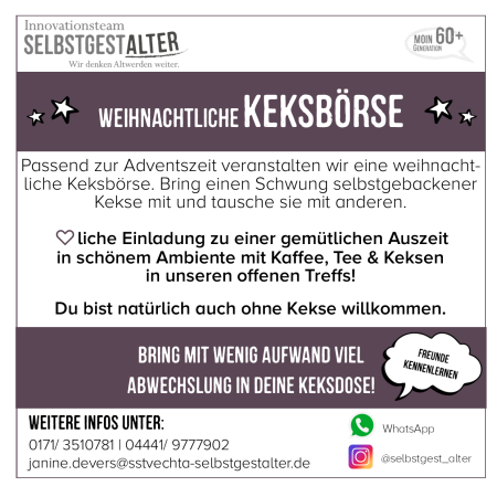 Du gehörst zur Generation 60+ und möchtest in der Vorweihnachtszeit einen schönen Nachmittag in Gemeinschaft verbringen? Dann komm vorbei!