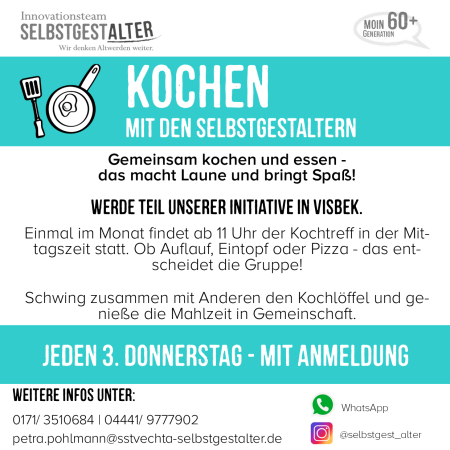 Wer Interesse hat, am gemeinsamen Kochen teilzunehmen, ist herzlich willkommen. Aufgrund der begrenzten Teilnehmerzahl und für eine bessere Planung, wird um Anmeldung beim Innovationsteam selbstgestALTER unter Tel. 04441-9777902 oder 0171-3510684 gebeten.