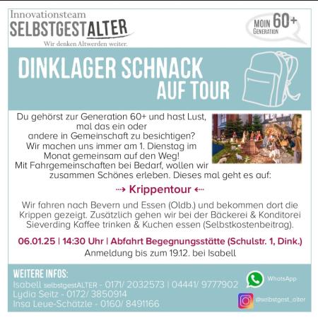 Du gehört zur Generation 60+ und hast Lust, mal das ein oder andere in Gemeinschaft zu besichtigen? Dann komm zum DINKLAGER SCHNACK AUF TOUR. Immer am 1. Dienstag im Monat machen wir uns gemeinsam auf den Weg. Mit Fahrgemeinschaften - bei Bedarf - wollen wir zusammen Schönes erleben.