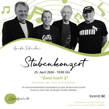 Wir freuen uns am 25. April 2026 die „Kult“- Band „Zwei hoch 2“ bei uns in der Guten Stube begrüßen zu dürfen.