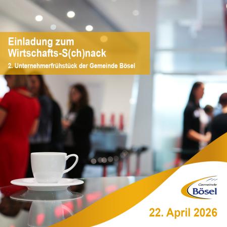 Die Gemeinde Bösel lädt Unternehmerinnen und Unternehmer aus dem Gemeindegebiet zum 2. Böseler Unternehmerfrühstück ein. Der Wirtschafts-S(ch)nack ist eine jährliche Veranstaltung, um den Austausch und die Zusammenarbeit in der lokalen Wirtschaft weiter zu stärken.
