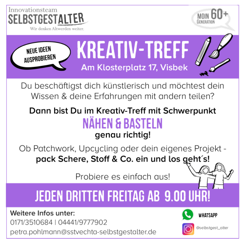 Offener Kreativtreff mit Schwerpunkt Nähen & Basteln 20.02.2026, 9:00 Uhr + 10 weitere Termine Offener Selbstgestalter-Treff Visbek Sonstige Events
